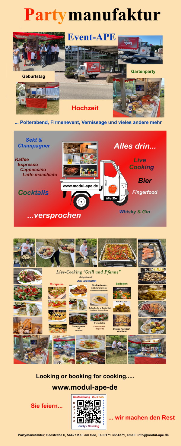 Unsere APE als Eyecatcher mit Live-Cooking, können Sie ab sofort exclusiv im Landkreis Trier/Saarburg, im Saarland, Luxemburg und im Moseltal buchen.